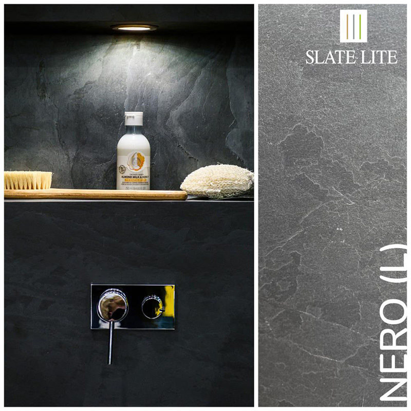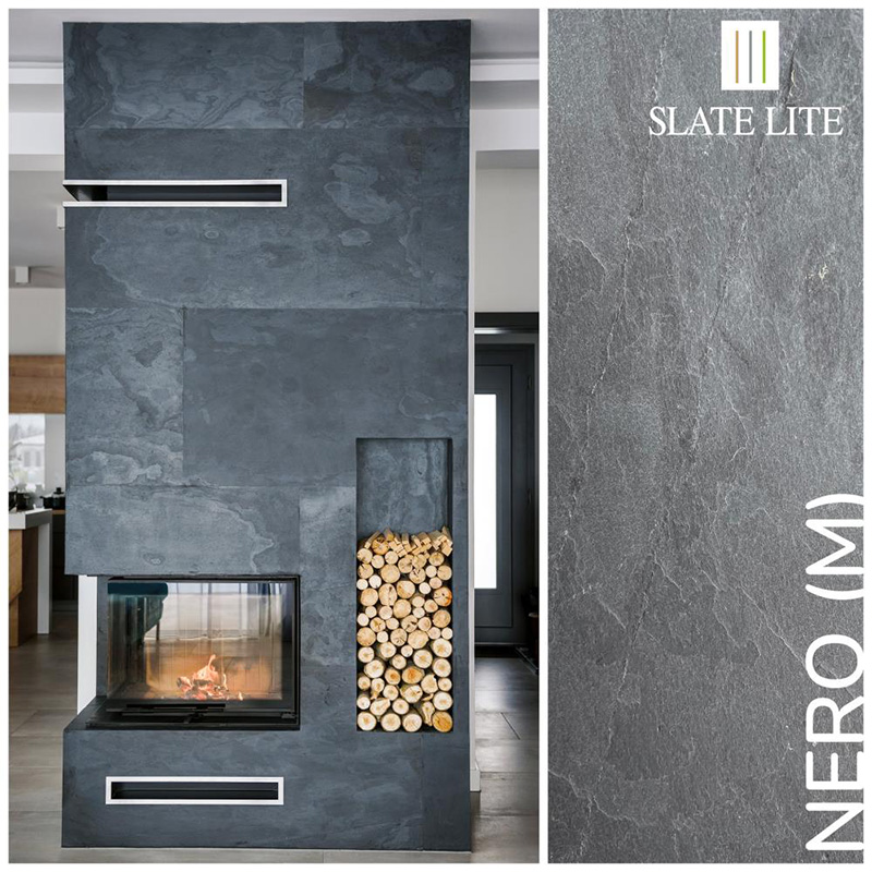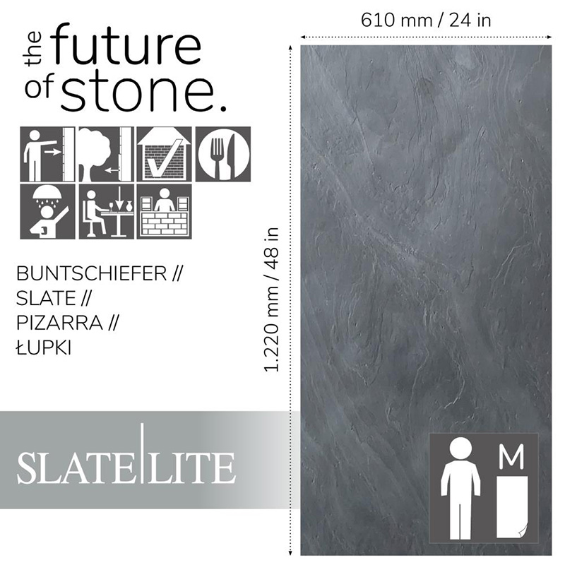 Συλλογή Καπλαμάδων Πέτρας SLATE LITE σε πάχος 1,5mm. Η 100% φυσική πέτρινη επιφάνεια ενισχύεται στη πίσω πλευρά με υαλοβάμβακα σε ρευστή μορφή, για μεγαλύτερη σταθερότητα και ευκολία επεξεργασίας. Είναι κατάλληλο τόσο για εσωτερική όσο και για εξωτερική χρήση, για επένδυση τοίχων, δάπεδο ή ως πλακάκι στην κουζίνα. Ακόμη και σε υγρούς χώρους όπως μπάνια ή ντους. Τοποθετείται εύκολα και η τιμή του αφορά το κάθε τεμάχιο. Παραδίδεται σε φύλλα, τα οποία εφάπτονται μεταξύ τους χωρίς να φαίνεται η ένωση.